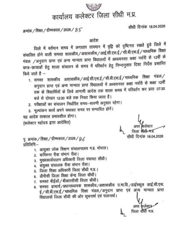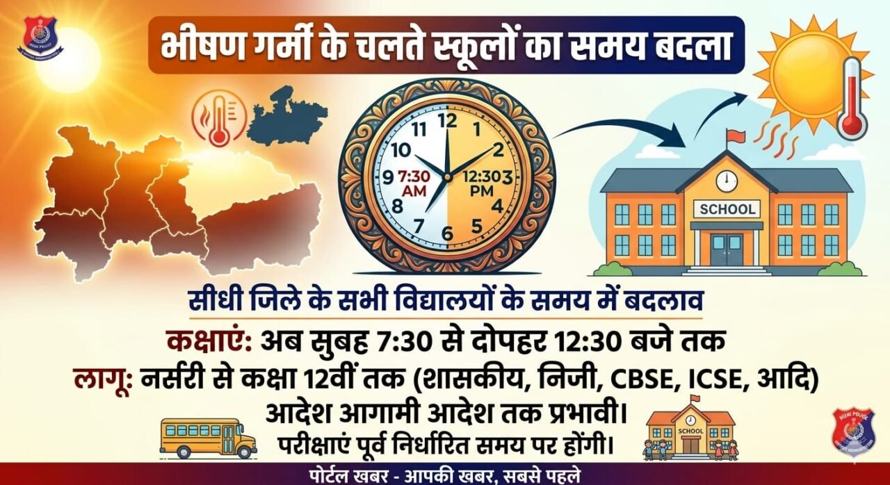 जिले में लगातार बढ़ते तापमान और भीषण गर्मी को देखते हुए प्रशासन ने विद्यार्थियों के स्वास्थ्य को ध्यान में रखते हुए बड़ा फैसला लिया है। जिला प्रशासन द्वारा जिले में संचालित समस्त शासकीय, अशासकीय, आई.सी.एस.ई., सी.बी.एस.ई., माध्यमिक शिक्षा मंडल, अनुदान प्राप्त एवं अन्य मान्यता प्राप्त विद्यालयों के संचालन समय में बदलाव के आदेश जारी किए गए हैं।